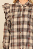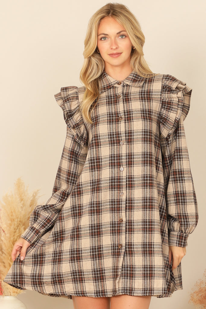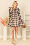 Get ready to turn heads with this stylish and versatile long sleeve plaid dress. With its unique ruffle detail and comfortable fit, this dress will keep you looking and feeling your best all day long. Perfect for any occasion, from work to a night out, this dress is a must-have in your wardrobe!