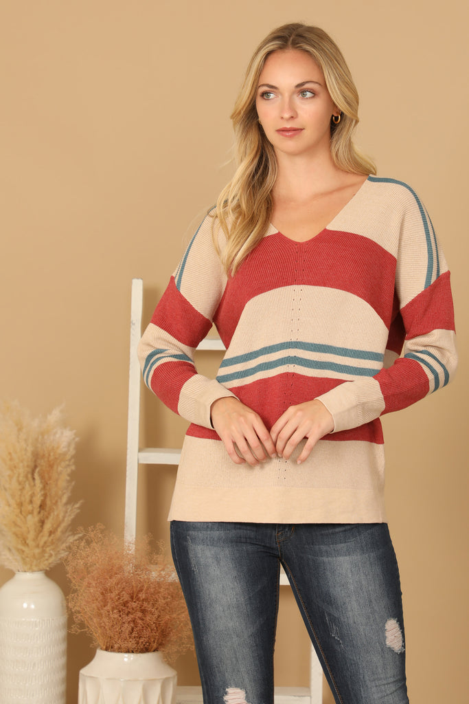 Stay cozy and stylish with our V-NECK STRIPE KNITTED SWEATER! The classic V-neck design paired with trendy striped knit pattern will keep you warm and fashionable. Perfect for any occasion, this sweater is a must-have in your wardrobe.
