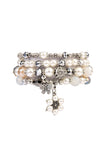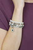 Going heavy on eye-catching detail, this stack of bracelets features a mix of ornate etching and charm accents with think beads, stones, and more.