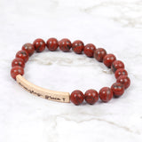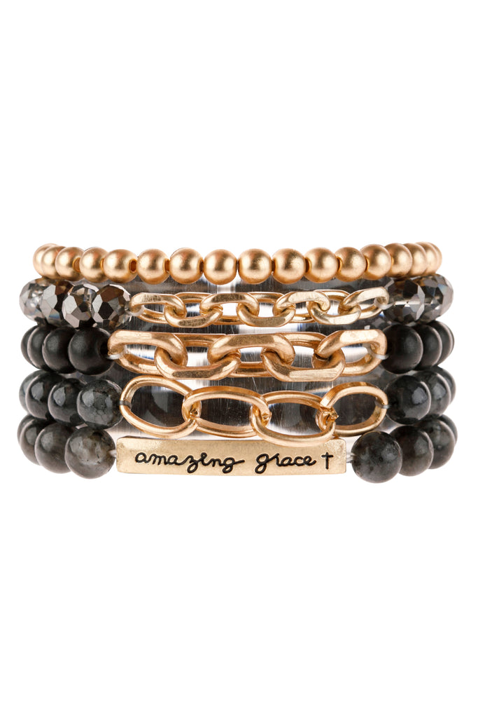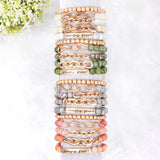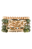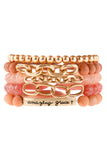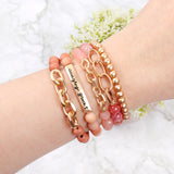 Cute and chic stretch bracelets adorned with multiple beads and a blissful engraved message in gold finished beads. You can mix n' match to create a unique arm candy collection or wear solo.