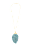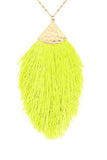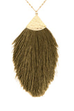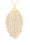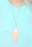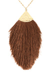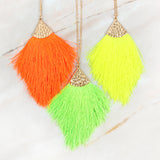 Bold and exciting, this long-line tassel necklace is anything but subtle. Set on a long, gold-tone chain and tonal fringe fanning out across the bottom, pairs perfect with a solid-color top, and let it do what it does best! Statement!