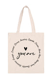 Experience fashion and functionality with the YOU ARE PRINT MINIMALIST FASHION TOTE BAG. This sleek and stylish tote bag is perfect for everyday use, with a spacious design to carry all your essentials. Show off your unique style with the YOU ARE print, while staying organized and on-trend. Elevate your outfit and make a statement with this must-have accessory.