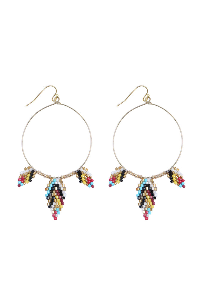 Elevate your look with these elegant bohemian earrings. Showcasing a leaf shape and accented with delicate glass seed beads, these hoop earrings add a touch of whimsy to any outfit.