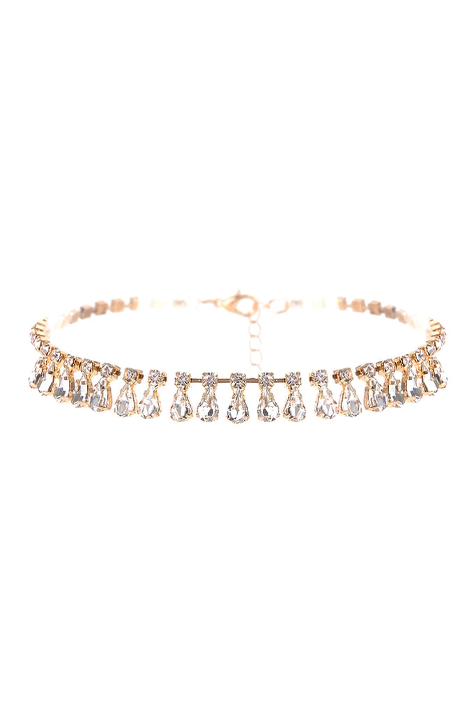 Be the life of the party with this tear-drop rhinestone station choker necklace. You'll turn heads with its sparkly, statement-making design. It's the perfect accessory to add some edge to any ensemble. Get ready to shine!