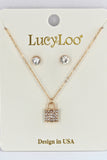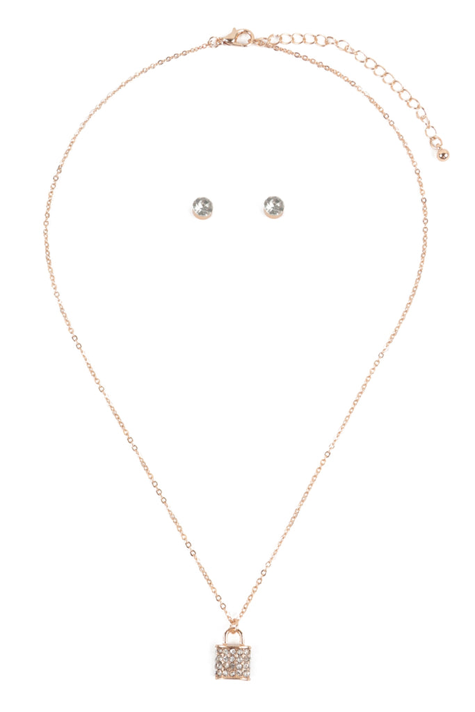 This unique set of jewelry is a must-have for your collection. Shine with a gold pendant featuring a stylish lock and stud earrings that match. Add flair and edge to any ensemble with this bold and daring set — it's sure to steal the show!