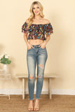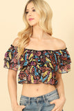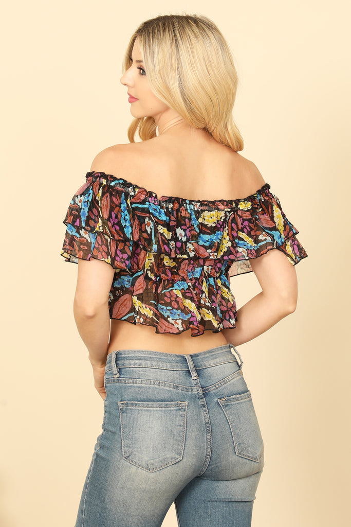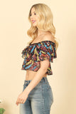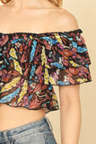 This trendy Off Shoulder Ruffle Detail Printed Crop Top is a must-have for any fashion-forward woman. The off-shoulder design and ruffle detailing add a touch of femininity, while the vibrant print makes a statement. Made with high-quality materials, this crop top is both comfortable and stylish. Perfect for any occasion, this top effortlessly combines fashion and function.