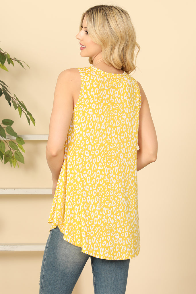 This top combines stylish leopard print with a flowy, sleeveless design. Look effortlessly chic and stay cool in the warmer months thanks to the lightweight fabric and flattering hemline. Perfect for any casual or dressy occasion.