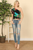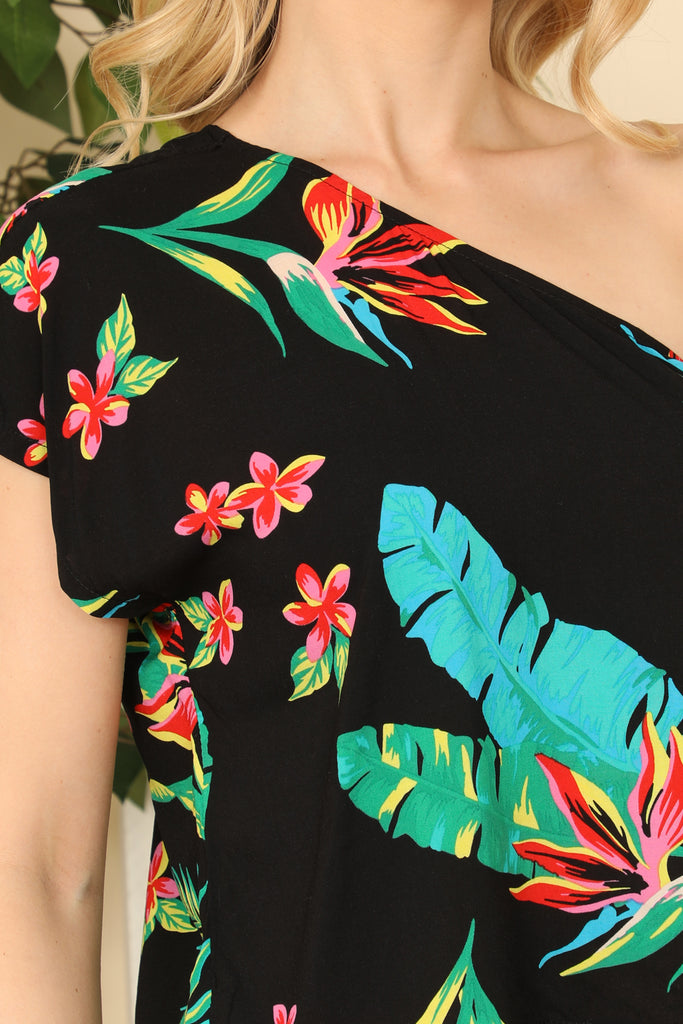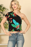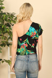 Look stylish and stay cool in our Tropical One Shoulder Short Sleeve Crop Top. With a unique one shoulder design and short sleeves, this top will elevate your look and keep you comfortable. Perfect for warm weather, this top is a must-have for your summer wardrobe.