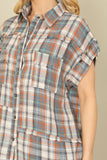 COLLARED CUFF SLEEVE FRONT POCKET PLAID TOP