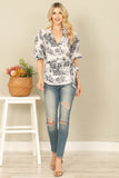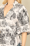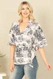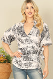 COLLARED V-NECK PUFF SLEEVE WAIST TIE PRINTED TOP