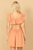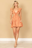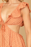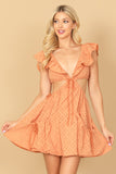 DEEP NECK RUFFLE DETAIL SIDE CUT-OUT EYELET MINI DRESS