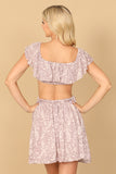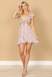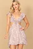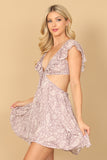 DEEP NECK RUFFLE DETAIL SIDE CUT-OUT PAISLEY MINI DRESS