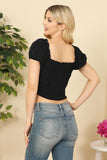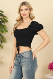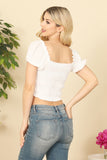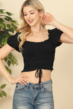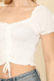 This crop top features a front and smocked details, creating a flattering silhouette. The puff sleeves add a touch of volume for a playful and trendy look. Stay stylish and confident with this versatile top.
