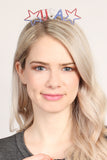 Get your hands up 'cause it's a party in the USA! A summer-ready headband, featuring a red, white, and blue USA accent with rhinestones and a metallic band.