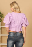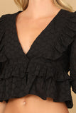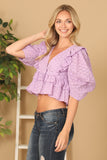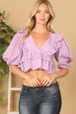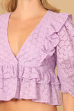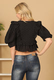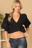V-NECK EYELET RUFFLE DETAIL PUFF SLEEVE CROP TOP