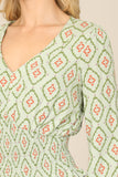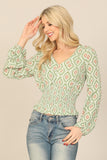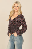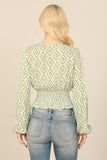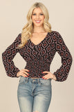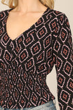 V-NECK LONG SLEEVE SMOCKED RUFFLE WAIST PRINTED TOP