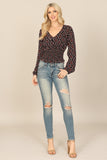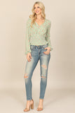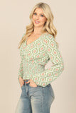 Elevate your style with our V-neck printed top. This long sleeve top features a smocked ruffle waist for a flattering fit. Perfect for any occasion, its versatile design combines comfort and fashion effortlessly. Complete your wardrobe with this must-have staple.