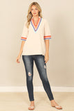 V-NECK MANDARIN COLLAR WAVE PRINT HALF SLEEVE TOP