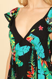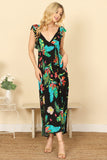 V-NECK RUFFLE SLEEVELESS SIDE SLIT TROPICAL PRINT MAXI DRESS