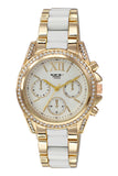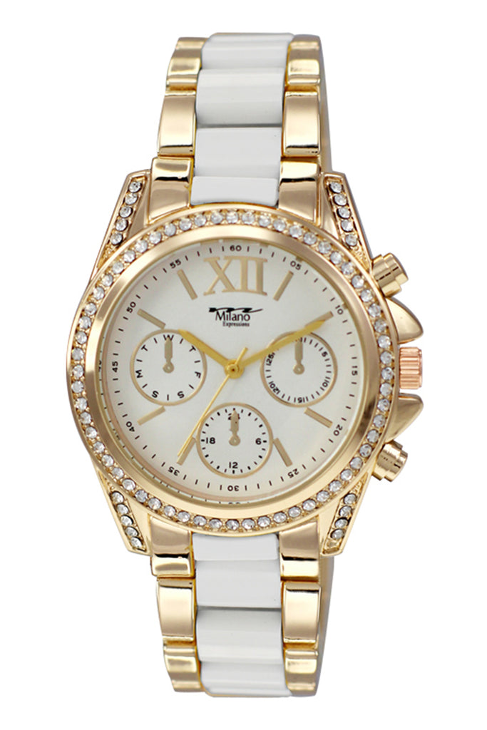 Perfect for matching your jewels with this chronograph white watch, gold-tone metal featuring an hour, minute, and second hand, a date window, and three eye chronograph detail.