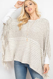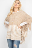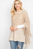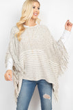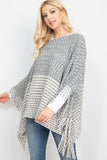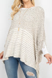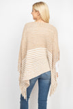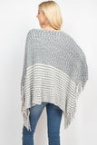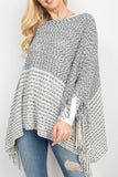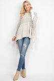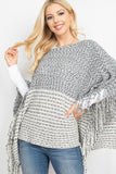 A cable knit poncho featuring an open-hole pattern and fringed hem. A sided v-neckline for added style! It's perfect to throw over outfits for a subtle touch and to keep warm on chilly days/nights!