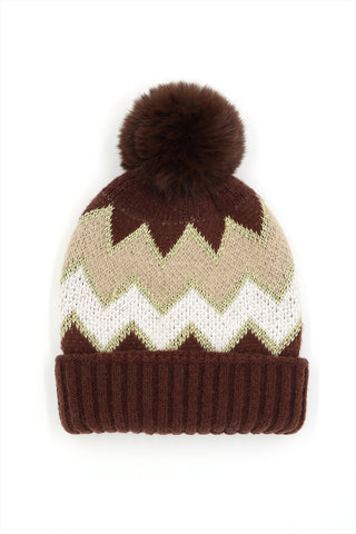 CHEVRON POMPOM FUZZY FLEECE BEANIE