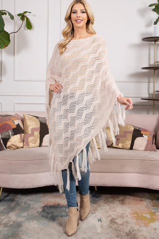 KNITTED NET WAVE PATTERN FRINGE TASSEL PONCHO