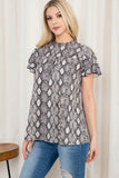 Love this snakeskin print top, featuring a short butterfly sleeve cut, pleat detail, and a ruffled round neckline. Keep it casual by pairing it with shorts and an oversized cardigan, or wear it with dress pants and flats for an office-ready look.