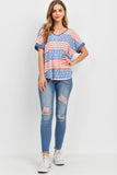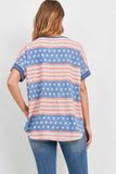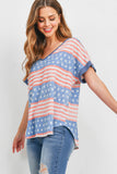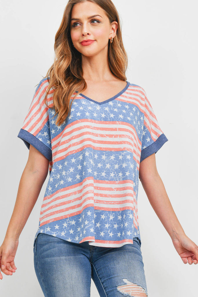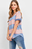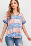 A stylish American flag accent top collection, featuring short-cut sleeves, a v-neckline, and a relaxed silhouette. Easily pair with jeans. Style yourself with a casual-chic work-to-weekend look!
